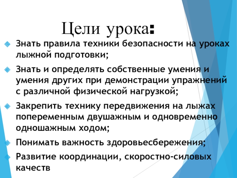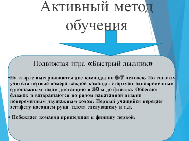 Урок распланирован так, что все предлагаемые игры-задания идут от простого к сложному. Исходя из темы урока, каждая игра дает возможность отработать определенную технику лыжных ходов, научить скольжению на лыжах, работе рук. Во время выполнения задания, класс разбивается по группам так, чтобы была видна работа как сильных, так и слабых учеников. Последняя игра-задание дает возможность увидеть степень овладение учащимися техникой лыжных ходов.