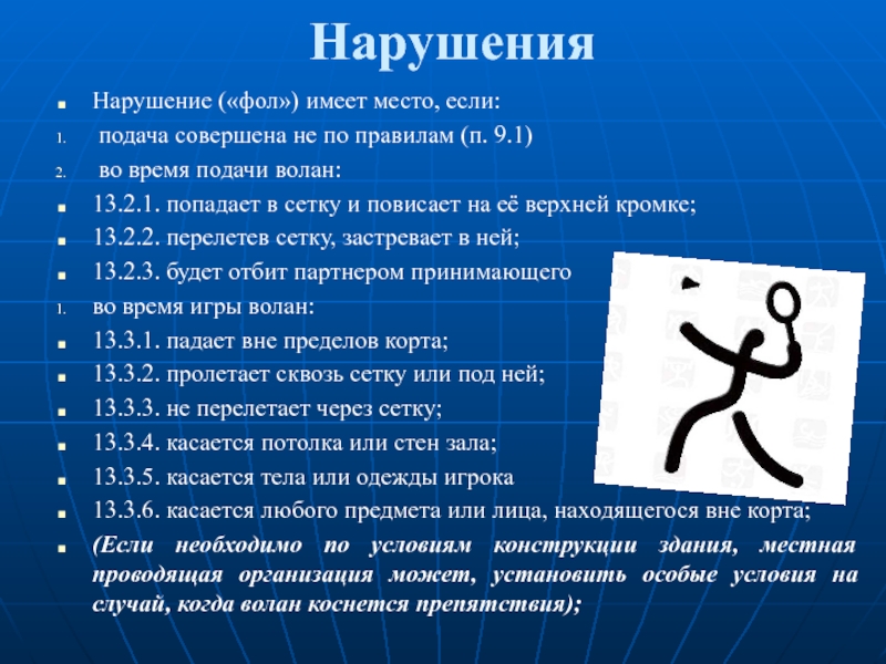 9.1.6. стержень ракетки подающего, в момент удара по волану, должен иметь наклон вниз;