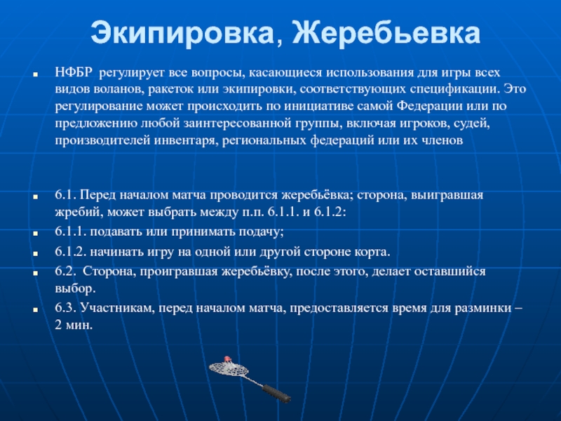 видов воланов, ракеток или экипировки, соответствующих спецификации. Это регулирование может происходить по инициативе самой Федерации или по предложению любой заинтересованной группы, включая игроков, судей, производителей инвентаря, региональных федераций или их членов