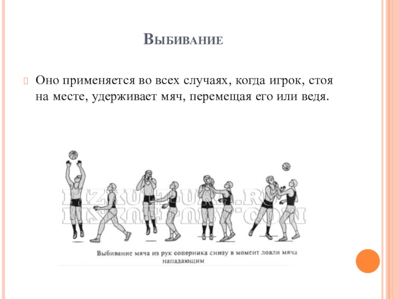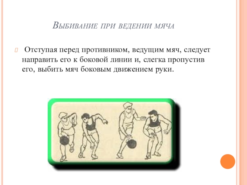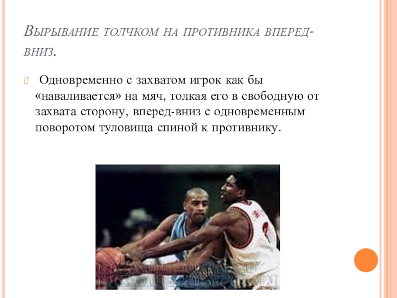 на мяч, толкая его в свободную от захвата сторону, вперед-вниз с одновременным поворотом туловища спиной к противнику.