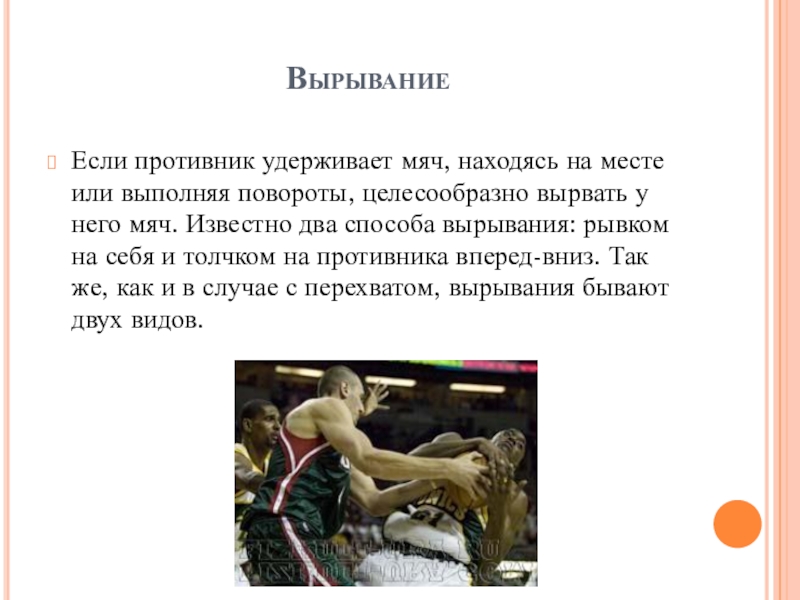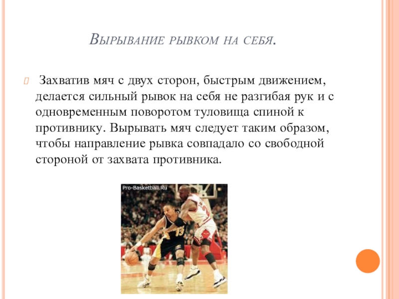 сильный рывок на себя не разгибая рук и с одновременным поворотом туловища спиной к противнику. Вырывать мяч следует таким образом, чтобы направление рывка совпадало со свободной стороной от захвата противника.