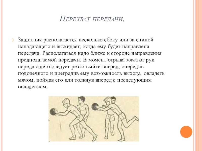 когда ему будет направлена передача. Располагаться надо ближе к стороне направления предполагаемой передачи. В момент отрыва мяча от рук передающего следует резко выйти вперед, опередив подопечного и преградив ему возможность выхода, овладеть мячом, поймав его или толкнув вперед с последующим овладением.