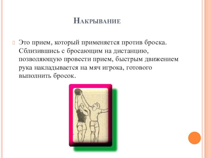 позволяющую провести прием, быстрым движением рука накладывается на мяч игрока, готового выполнить бросок.