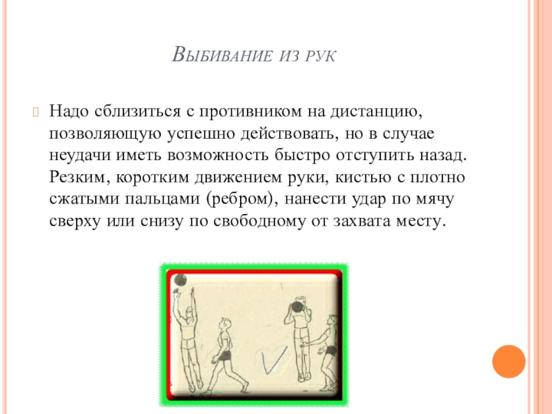 но в случае неудачи иметь возможность быстро отступить назад. Резким, коротким движением руки, кистью с плотно сжатыми пальцами (ребром), нанести удар по мячу сверху или снизу по свободному от захвата месту.