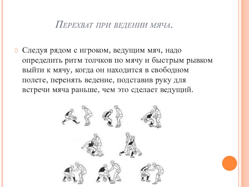 ритм толчков по мячу и быстрым рывком выйти к мячу, когда он находится в свободном полете, перенять ведение, подставив руку для встречи мяча раньше, чем это сделает ведущий.