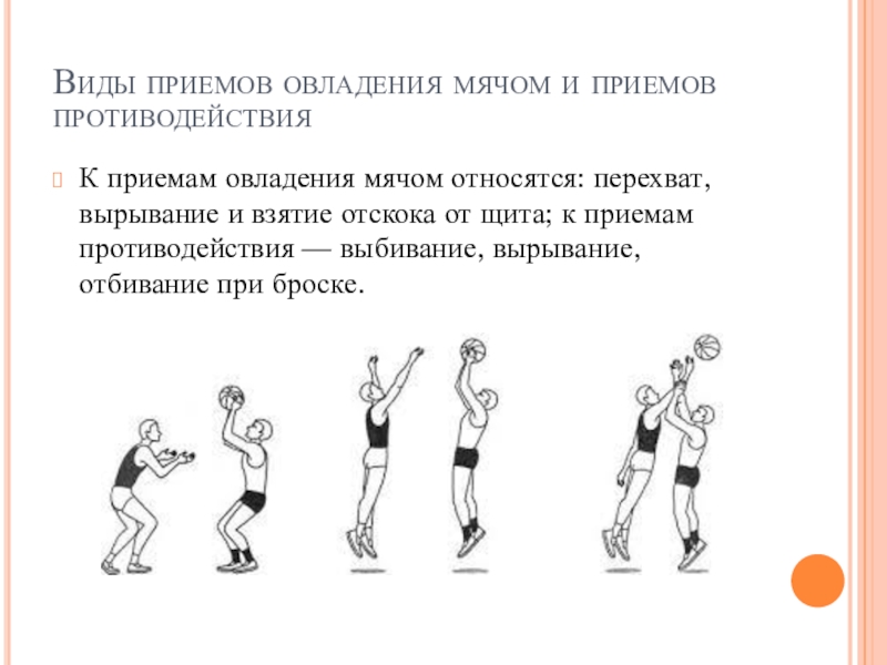 перехват, вырывание и взятие отскока от щита; к приемам противодействия — выбивание, вырывание, отбивание при броске.