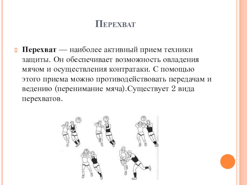 и осуществления контратаки. С помощью этого приема можно противодействовать передачам и ведению (перенимание мяча).Существует 2 вида перехватов.