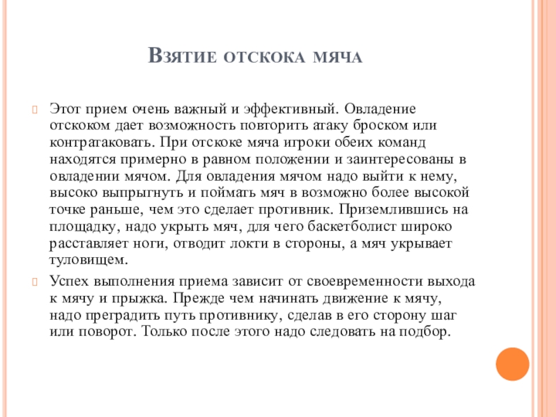 возможность повторить атаку броском или контратаковать. При отскоке мяча игроки обеих команд находятся примерно в равном положении и заинтересованы в овладении мячом. Для овладения мячом надо выйти к нему, высоко выпрыгнуть и поймать мяч в возможно более высокой точке раньше, чем это сделает противник. Приземлившись на площадку, надо укрыть мяч, для чего баскетболист широко расставляет ноги, отводит локти в стороны, а мяч укрывает туловищем.