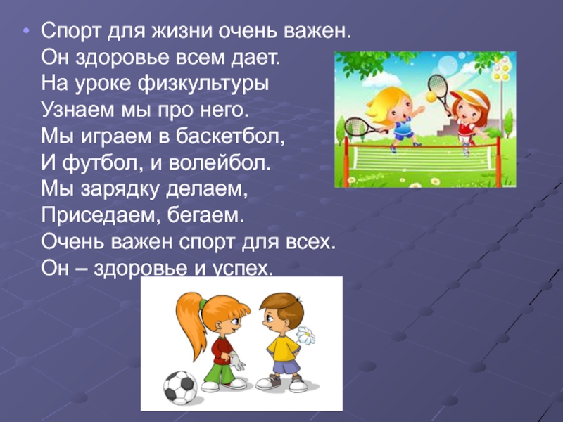Спорт для жизни очень важен. Он здоровье всем дает. На уроке физкультуры Узнаем мы про него. Мы