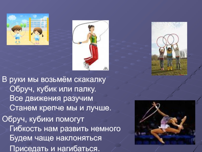В руки мы возьмём скакалку Обруч, кубик или палку. Все движения разучим Станем крепче мы и лучше. Обруч,