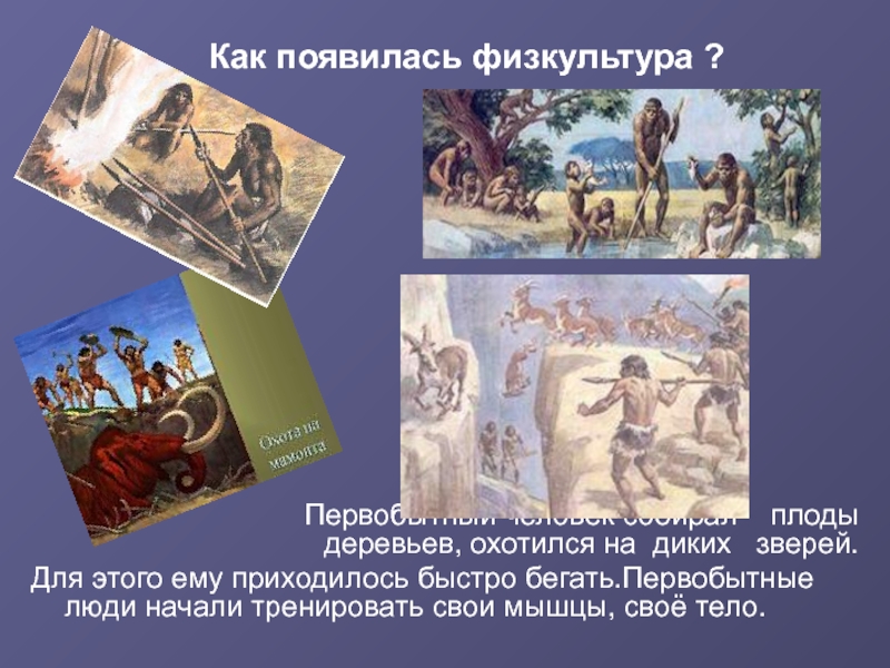 Как появилась физкультура ?Первобытный человек собирал плоды деревьев, охотился на диких зверей. Для этого ему приходилось быстро бегать.Первобытные люди начали тренировать свои мышцы, своё тело.