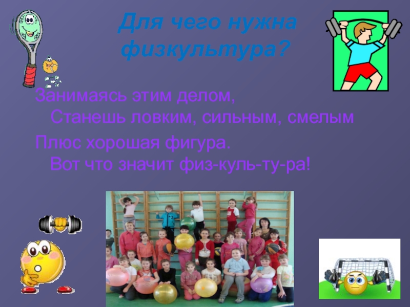 Для чего нужна физкультура?Занимаясь этим делом, Станешь ловким, сильным, смелымПлюс хорошая фигура. Вот что значит физ-куль-ту-ра!