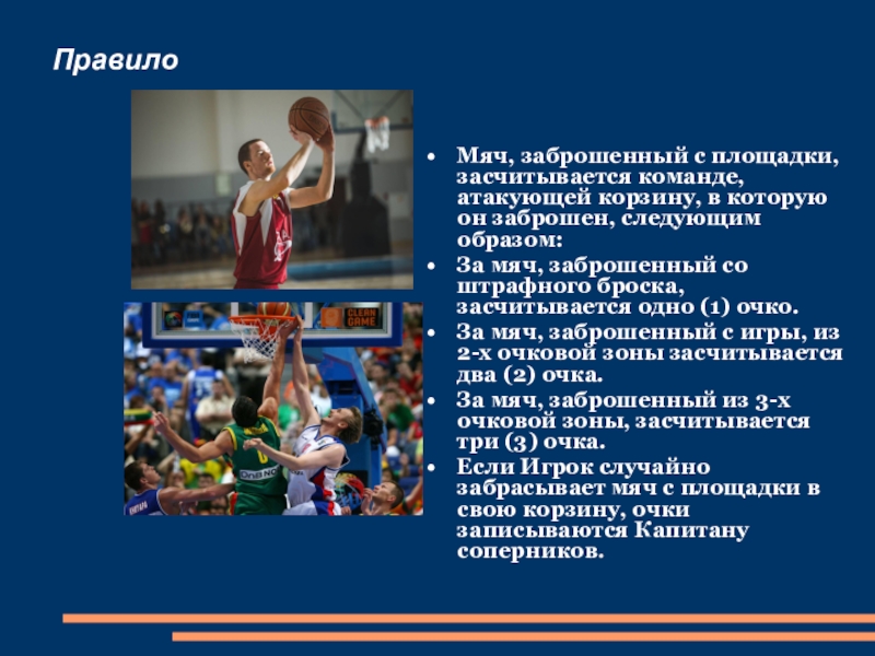 Если Игрок случайно забрасывает мяч с площадки в свою корзину, очки записываются Капитану соперников.