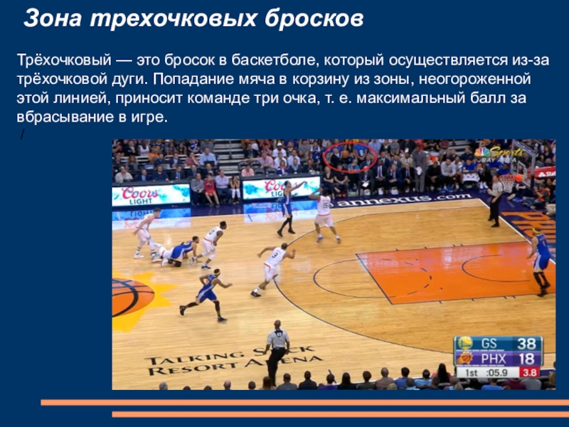 трёхочковой дуги. Попадание мяча в корзину из зоны, неогороженной этой линией, приносит команде три очка, т. е. максимальный балл за вбрасывание в игре.