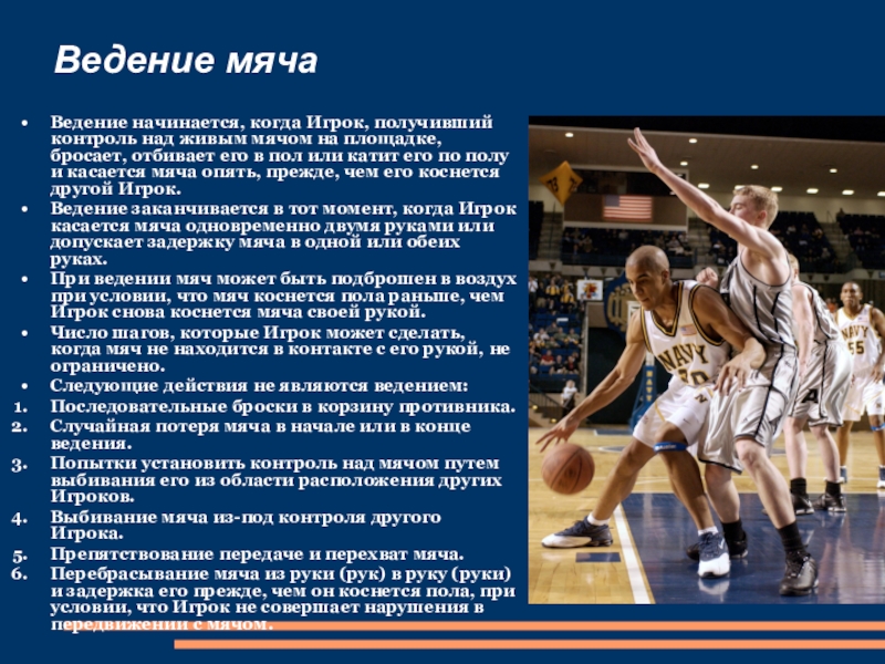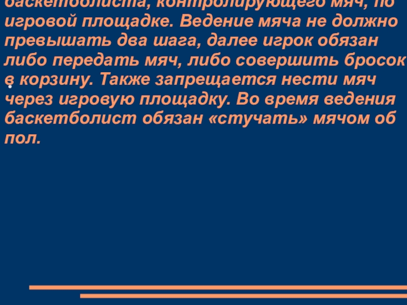 мяч, по игровой площадке. Ведение мяча не должно превышать два шага, далее игрок обязан либо передать мяч, либо совершить бросок в корзину. Также запрещается нести мяч через игровую площадку. Во время ведения баскетболист обязан «стучать» мячом об пол.