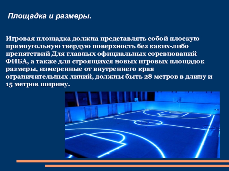 поверхность без каких-либо препятствий Для главных официальных соревнований ФИБА, а также для строящихся новых игровых площадок размеры, измеренные от внутреннего края ограничительных линий, должны быть 28 метров в длину и 15 метров ширину.