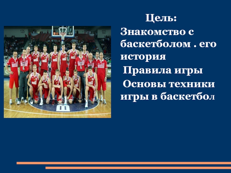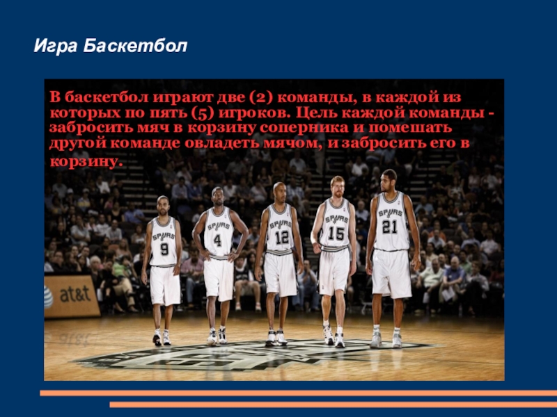 которых по пять (5) игроков. Цель каждой команды - забросить мяч в корзину соперника и помешать другой команде овладеть мячом, и забросить его в корзину.