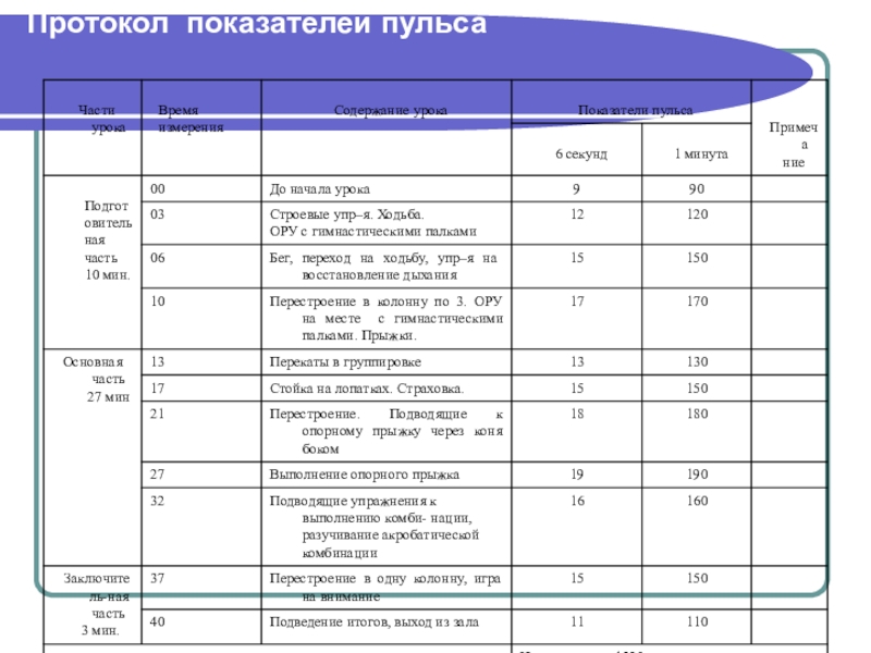 Протокол показателей пульса
