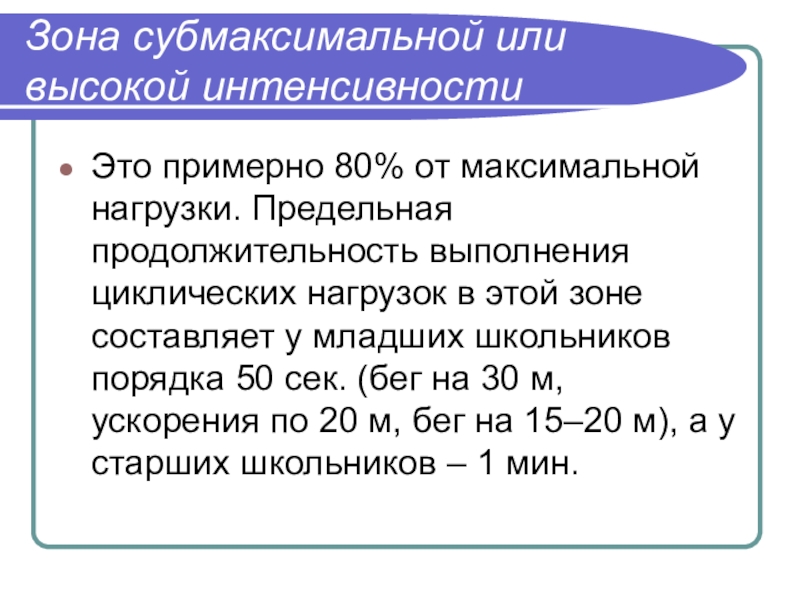 Зона субмаксимальной или высокой интенсивности Это примерно 80% от максимальной нагрузки. Предельная продолжительность выполнения циклических нагрузок в
