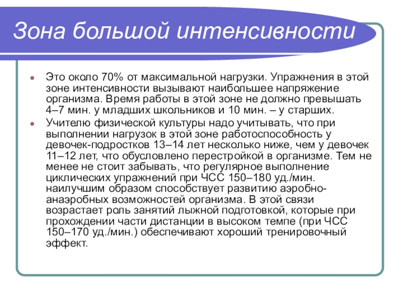 этой зоне интенсивности вызывают наибольшее напряжение организма. Время работы в этой зоне не должно превышать 4–7 мин. у младших школьников и 10 мин. – у старших.