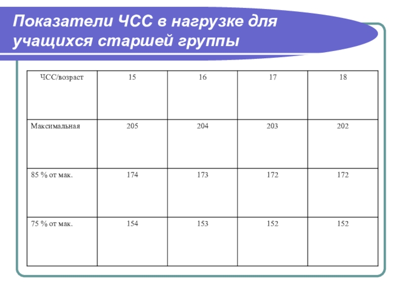 Слайд 10Показатели ЧСС в нагрузке для учащихся старшей группы