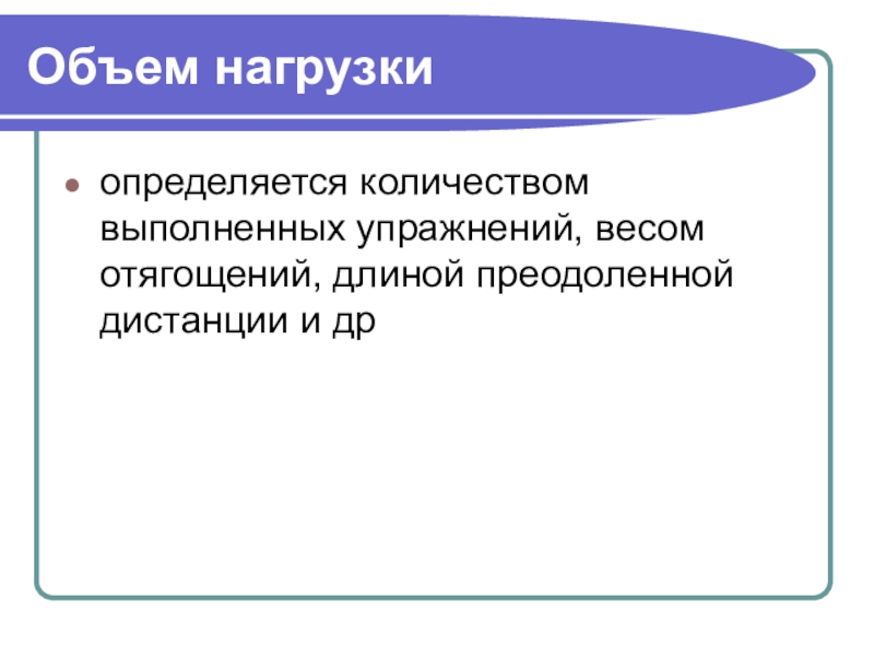 Объем нагрузкиопределяется количеством выполненных упражнений, весом отягощений, длиной преодоленной дистанции и др