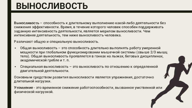 Выносливость – способность к длительному выполнению какой-либо деятельности без снижения эффективности.
