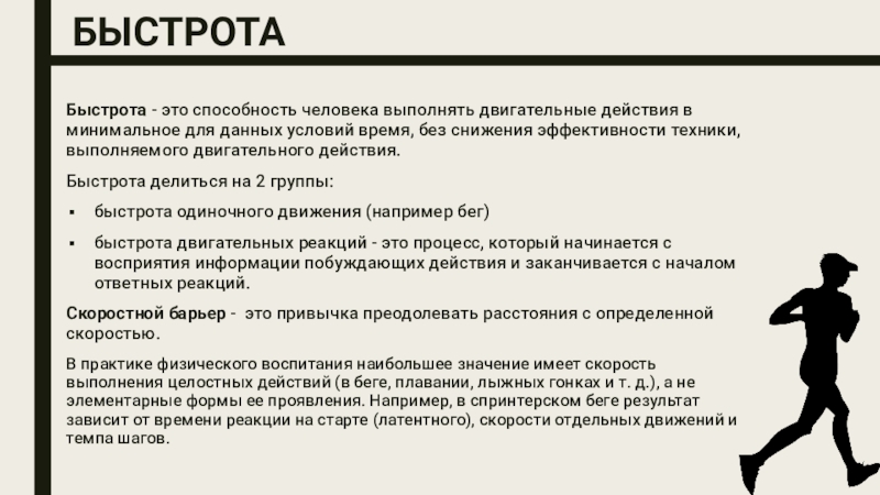 Быстрота - это способность человека выполнять двигательные действия в минимальное для