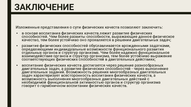развитие физических способностей обуславливается врожденными задатками, определяющими индивидуальные возможности функционального развития отдельных органов и структур организма. Чем более надежно функциональное взаимодействие органов и структур организма, тем более устойчиво выражение соответствующих физических способностей в двигательных действиях;