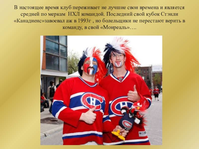 средней по меркам НХЛ командой. Последний свой кубок Стэнли «Канадиенс»завоевал аж в 1993г , но болельщики не перестают верить в команду, в свой «Монреаль»….