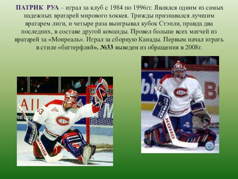 ДА ПРОСТЯТ МЕНЯ ОСТАЛЬНЫЕ ИГРОКИ, НО ОСОБЕННОЕ ВНИМАНИЕ ХОТЕЛОСЬ БЫ УДЕЛИТЬ ТАКИМ СУПЕР ЗВЕЗДАМ МИРОВОГО ХОККЕЯ КАК ВРАТАРИ: ЖАК ПЛАНТ, ПАТРИК РУА, ЗАЩИТНИКИ: СЕРЖ САВАР, ЛАРРИ РОБИНСОН, НАПАДАЮЩИЕ: ЖАН БЕЛИВО, МОРИС РИШАР, ГИ ЛАФЛЕР.