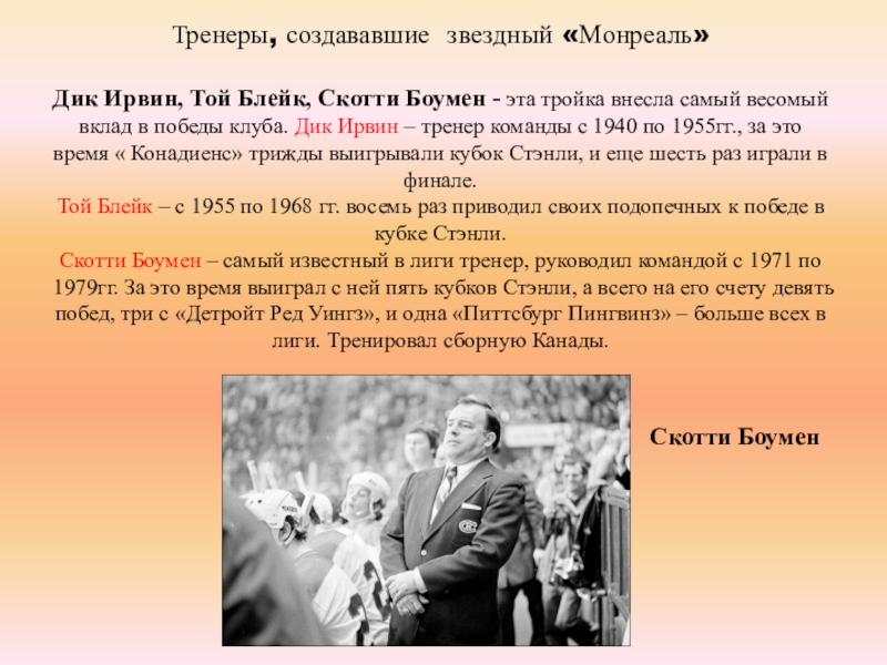 Скотти Боумен – самый известный в лиги тренер, руководил командой с 1971 по 1979гг. За это время выиграл с ней пять кубков Стэнли, а всего на его счету девять побед, три с «Детройт Ред Уингз», и одна «Питтсбург Пингвинз» – больше всех в лиги. Тренировал сборную Канады.
