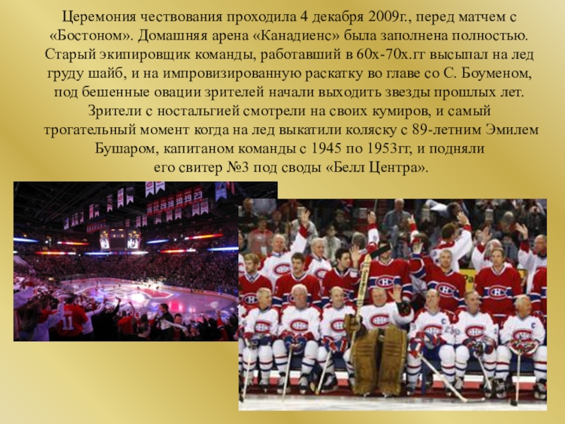 арена «Канадиенс» была заполнена полностью. Старый экипировщик команды, работавший в 60х-70х.гг высыпал на лед груду шайб, и на импровизированную раскатку во главе со С. Боуменом, под бешенные овации зрителей начали выходить звезды прошлых лет. Зрители с ностальгией смотрели на своих кумиров, и самый трогательный момент когда на лед выкатили коляску с 89-летним Эмилем Бушаром, капитаном команды с 1945 по 1953гг, и подняли