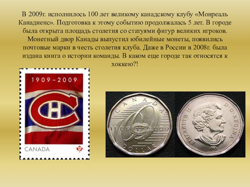 к этому событию продолжалась 5 лет. В городе была открыта площадь столетия со статуями фигур великих игроков. Монетный двор Канады выпустил юбилейные монеты, появились почтовые марки в честь столетия клуба. Даже в России в 2008г. была издана книга о истории команды. В каком еще городе так относятся к хоккею?!