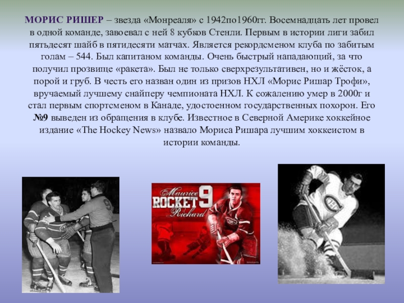 одной команде, завоевал с ней 8 кубков Стенли. Первым в истории лиги забил пятьдесят шайб в пятидесяти матчах. Является рекордсменом клуба по забитым голам – 544. Был капитаном команды. Очень быстрый нападающий, за что получил прозвище «ракета». Был не только сверхрезультативен, но и жёсток, а порой и груб. В честь его назван один из призов НХЛ «Морис Ришар Трофи», вручаемый лучшему снайперу чемпионата НХЛ. К сожалению умер в 2000г и стал первым спортсменом в Канаде, удостоенном государственных похорон. Его №9 выведен из обращения в клубе. Известное в Северной Америке хоккейное издание «The Hockey News» назвало Мориса Ришара лучшим хоккеистом в истории команды.