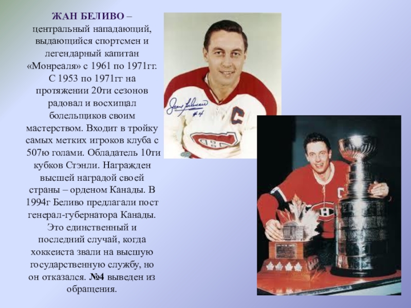 Слайд 11ЖАН БЕЛИВО – центральный нападающий, выдающийся спортсмен и легендарный капитан «Монреаля»