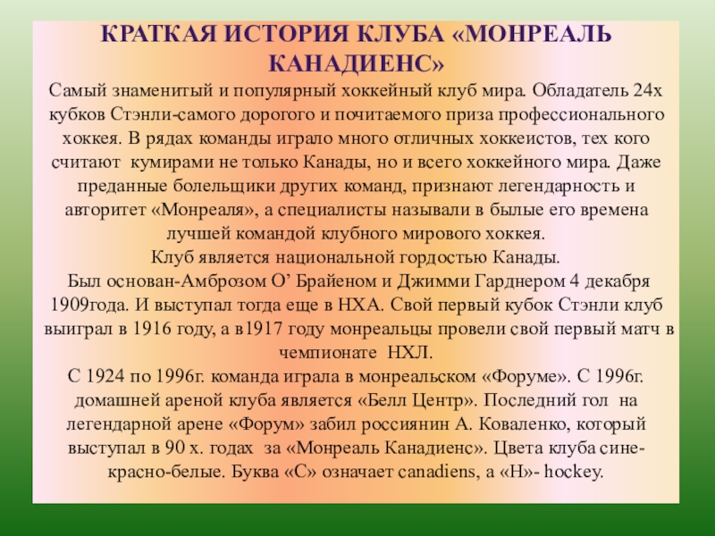 Слайд 2КРАТКАЯ ИСТОРИЯ КЛУБА «МОНРЕАЛЬ КАНАДИЕНС»