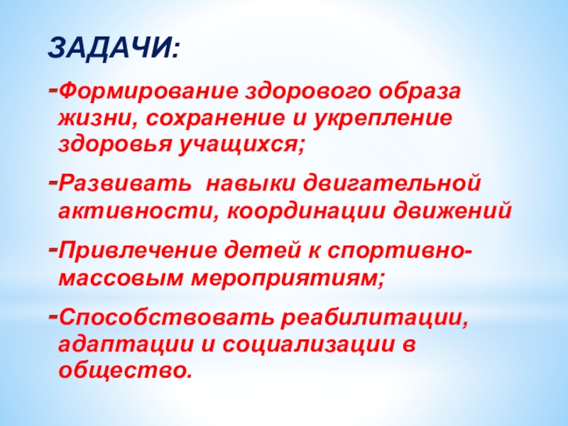 ЗАДАЧИ:Формирование здорового образа жизни, сохранение и укрепление здоровья учащихся;Развивать навыки двигательной активности, координации движенийПривлечение детей к спортивно-массовым