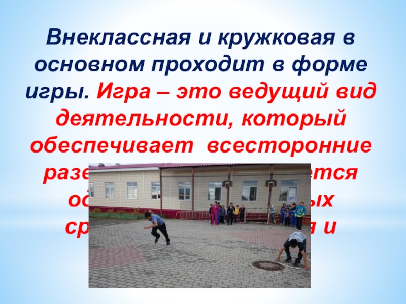 Внеклассная и кружковая в основном проходит в форме игры. Игра – это ведущий вид деятельности, который обеспечивает