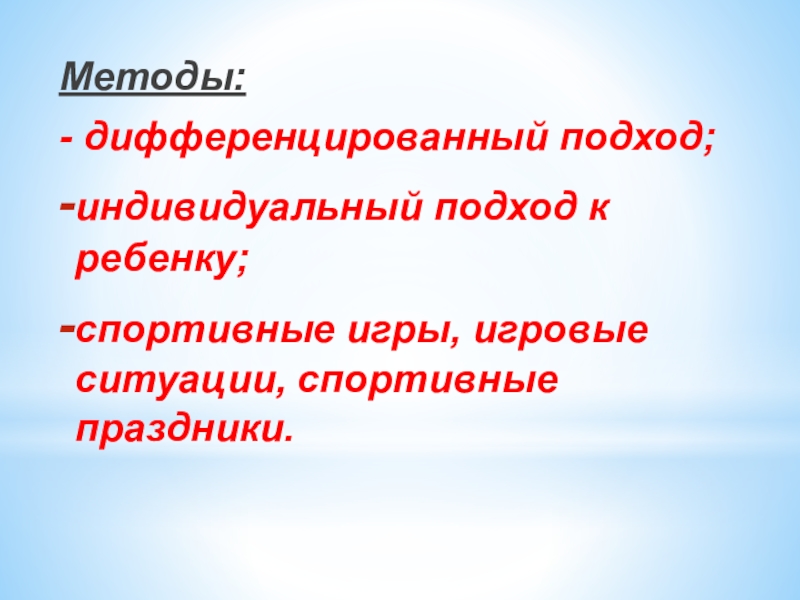 Методы:- дифференцированный подход;индивидуальный подход к ребенку; спортивные игры, игровые ситуации, спортивные праздники.