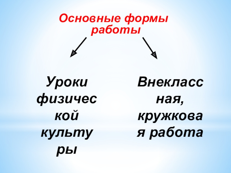 Основные формы работыУроки физической культурыВнеклассная, кружковая работа