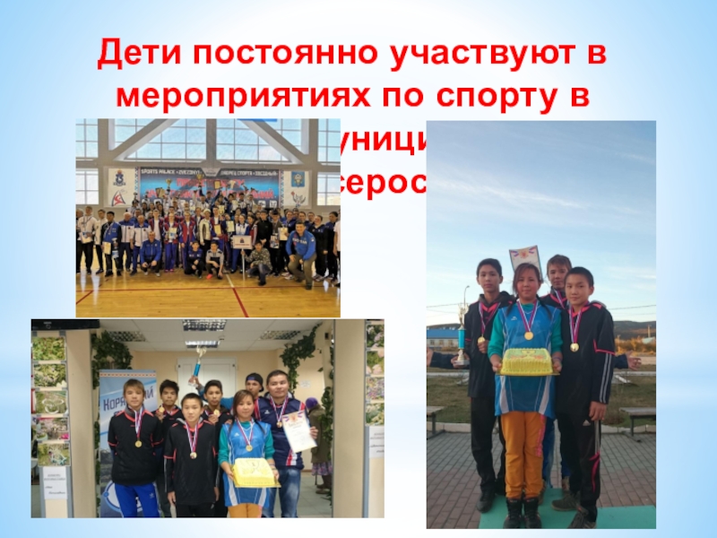 Слайд 10Дети постоянно участвуют в мероприятиях по спорту в школьных, муниципальных, краевых,