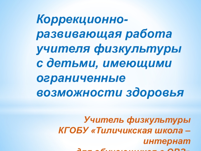Коррекционно-развивающая работа учителя физкультуры с детьми, имеющими ограниченные возможности здоровьяУчитель физкультуры КГОБУ «Тиличикская школа – интернат для