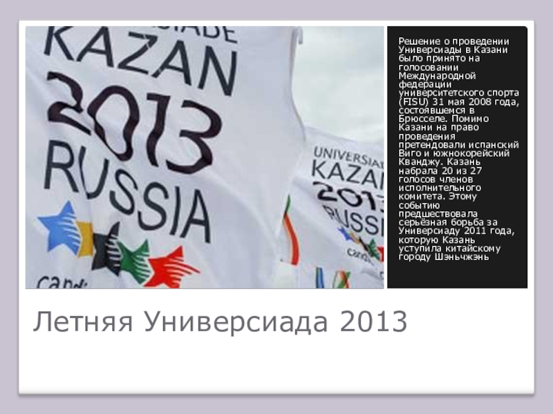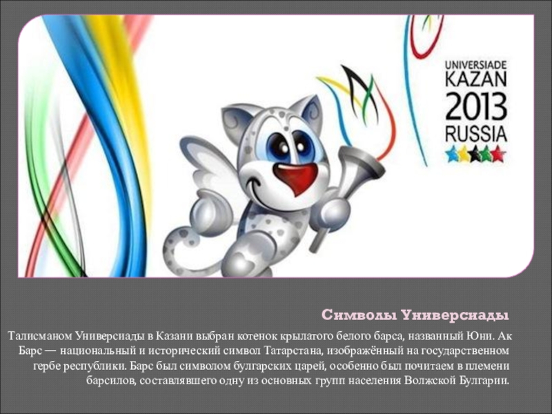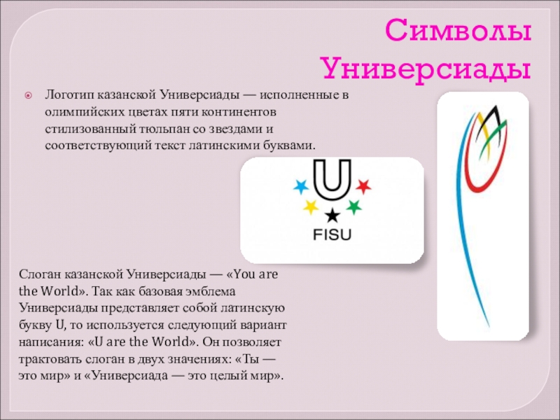 Слоган казанской Универсиады — «You are the World». Так как базовая эмблема Универсиады представляет собой латинскую букву U, то используется следующий вариант написания: «U are the World». Он позволяет трактовать слоган в двух значениях: «Ты — это мир» и «Универсиада — это целый мир».