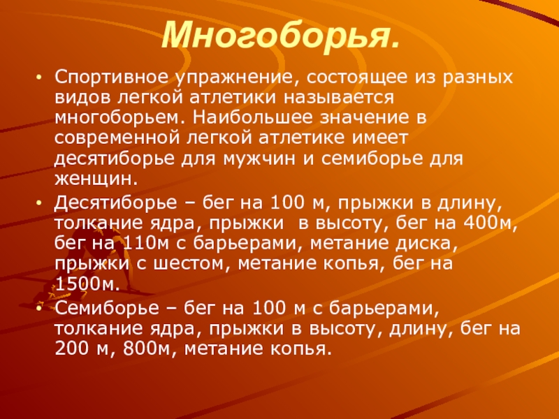 Десятиборье – бег на 100 м, прыжки в длину, толкание ядра, прыжки в высоту, бег на 400м, бег на 110м с барьерами, метание диска, прыжки с шестом, метание копья, бег на 1500м.
