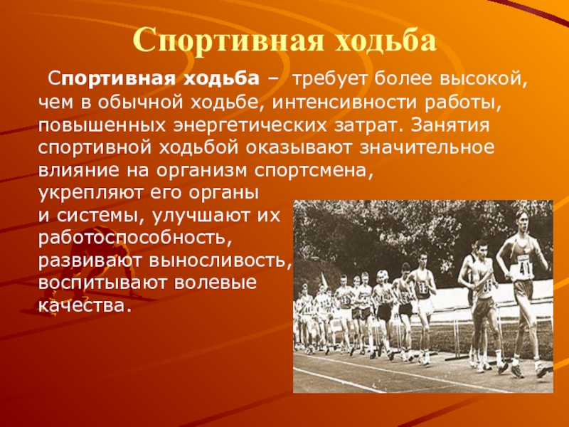 обычной ходьбе, интенсивности работы, повышенных энергетических затрат. Занятия спортивной ходьбой оказывают значительное влияние на организм спортсмена, укрепляют его органы и системы, улучшают их работоспособность, развивают выносливость, воспитывают волевые качества.