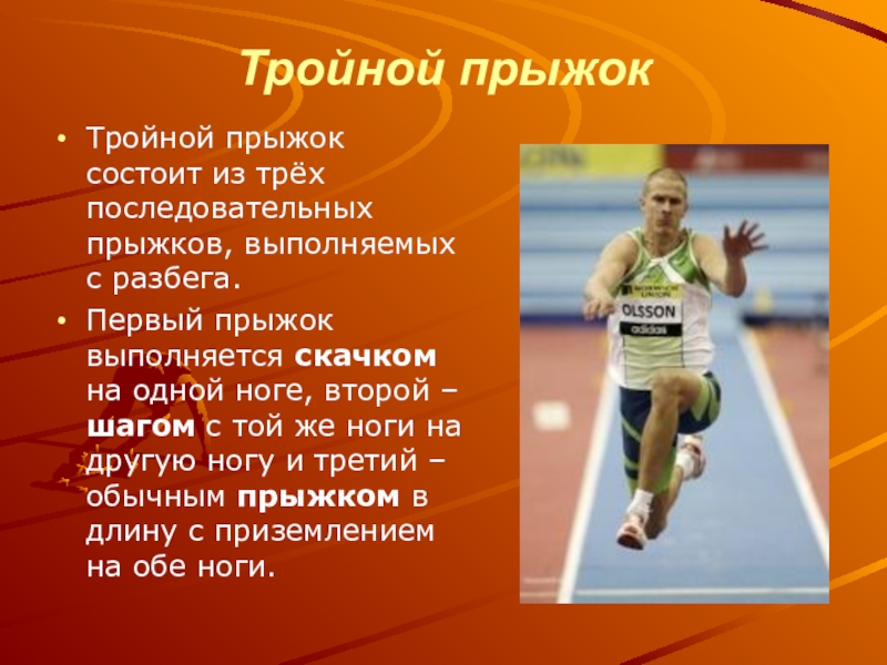 Тройной прыжок состоит из трёх последовательных прыжков, выполняемых с