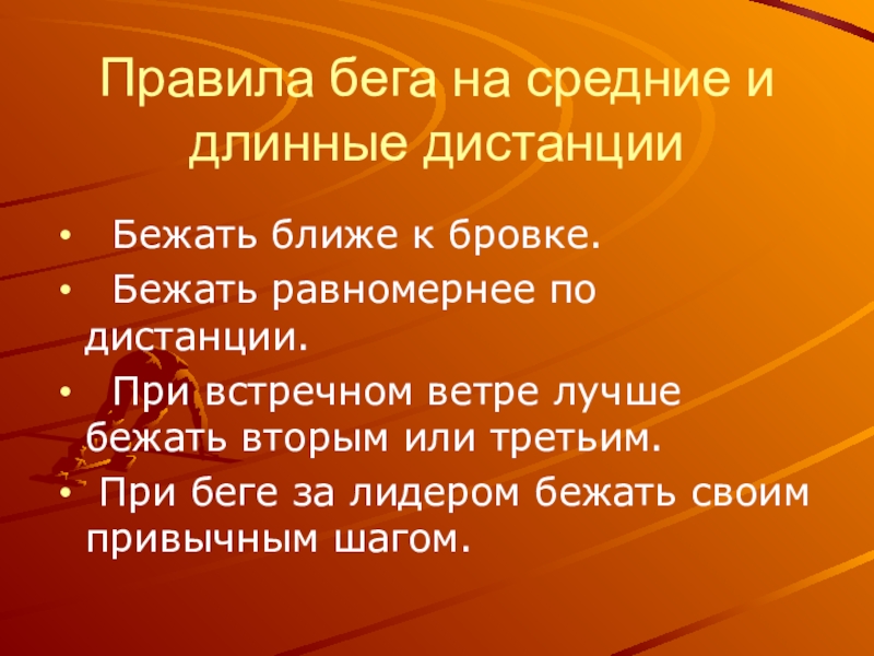 Бег заканчивается в момент, когда бегун коснётся туловищем вертикальной плоскости, проходящей через линию финиша. Ведущим качеством спринтера является быстрота.