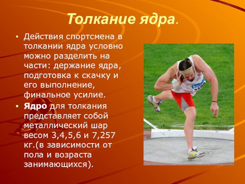 Ядро для толкания представляет собой металлический шар весом 3,4,5,6 и 7,257 кг.(в зависимости от пола и возраста занимающихся).