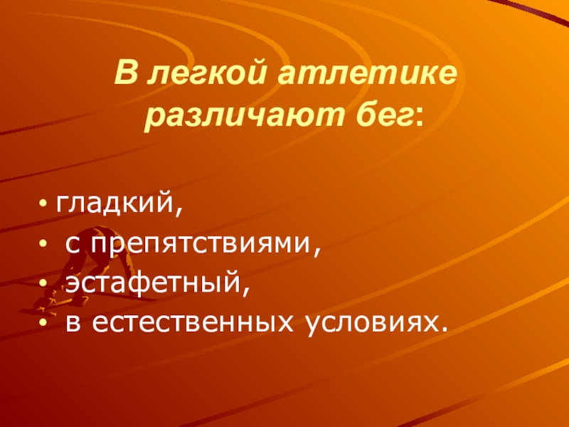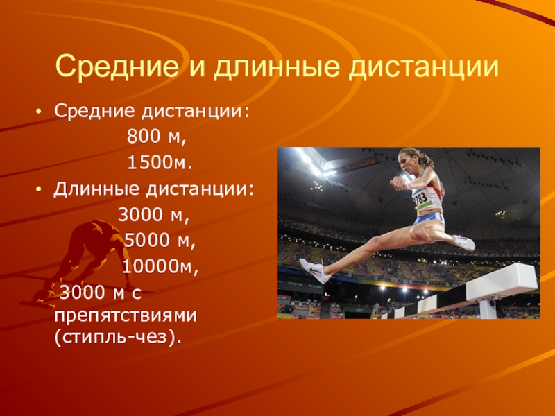достичь максимальной скорости в фазе стартового разбега. Обычно его длина 20 – 25 м. Максимально развитую скорость необходимо поддерживать до конца дистанции, а при возможности ускориться к финишу.